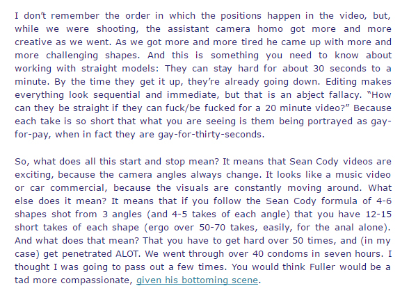 Sean Cody videos are exciting because the camera angles always change and the visuals are constantly moving around. It means that if you follow the Sean Cody formula of 4-6 shapes shot from 3 angles (and 4-5 takes of each angle) then you have 12-15 short takes of each shape (ergo over 50-70 takes, easily, for the anal alone). And what does that mean? That you have to get hard over 50 times, and (in my case) get penetrated ALOT.